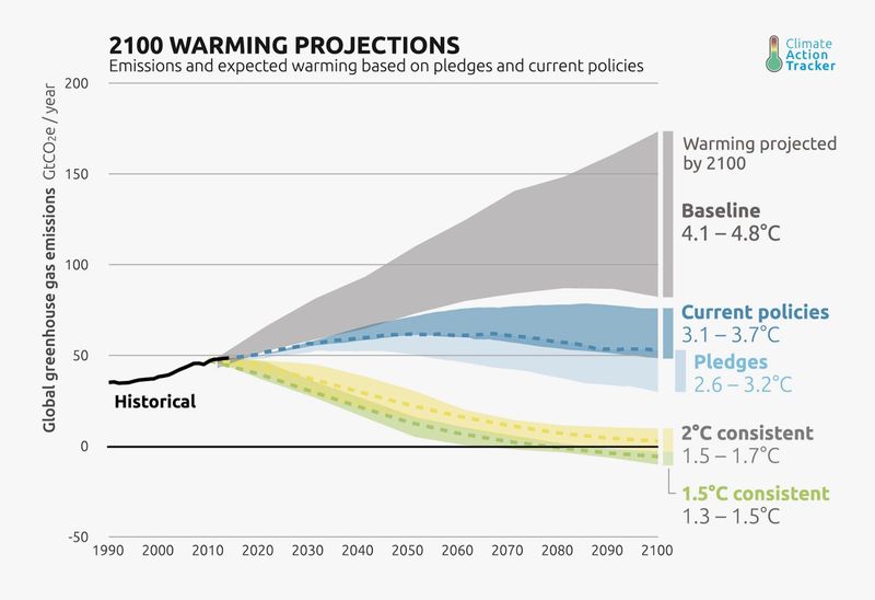 La caída de los precios tanto de las energías renovables como del gas natural ha contribuido a reducir modestamente las emisiones entre los grandes emisores como Europa y Estados Unidos. Sin embargo, ninguno de los cuatro mayores contaminantes del mundo (China, Estados Unidos, la Unión Europea y la India) está haciendo actualmente grandes contribuciones globales para alcanzar los objetivos del Acuerdo de París.